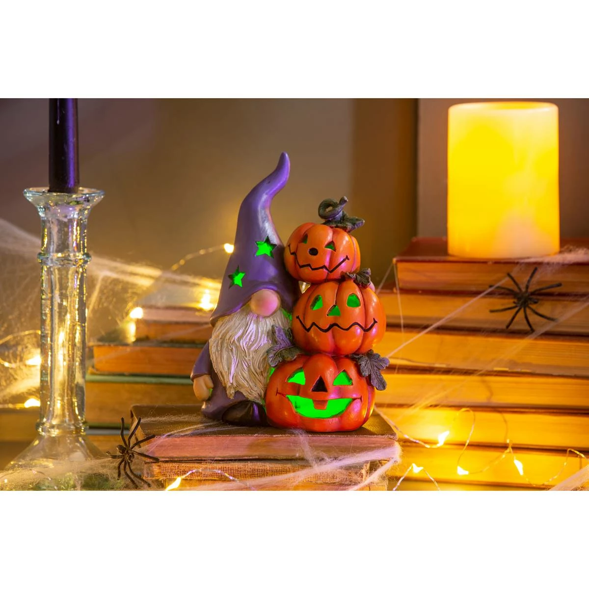 This Evergreen LED color changing gnome and pumpkins resin table decor will bring a touch of whimsy to your Halloween home. Decked out in a purple outfit, this festive character dons a matching hat that features star cutouts to allow the LED lights to shine through in celestial style. Three stacked jack-o-lanterns add to the festive glow of this charming piece. Enjoy as the lights change colors after turning on the switch located at the bottom. This cheerful gnome makes a fun accent for mantels, tabletops, shelves, desks, and more.