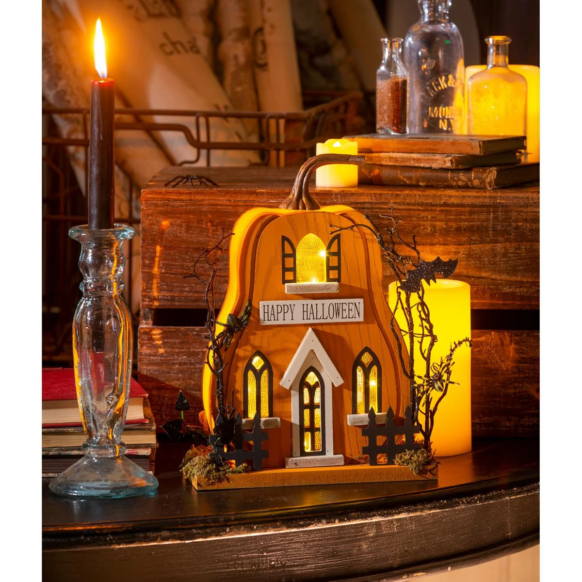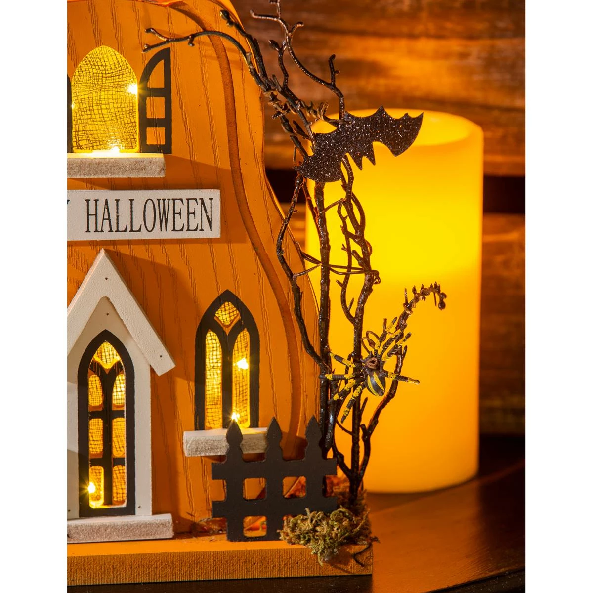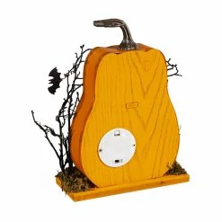 Family and guests will enjoy this Evergreen haunted house shaped like a portly pumpkin. The design includes bats, spiders, and other accents for added flair with a “Happy Halloween” greeting under the top window. This charming piece is brought to life at the flip of a switch as LED lights provide a festive glow from within. An on/off switch is on the back to power the LED lights. For indoor use only, this table decor is made of wood and plastic. This decorative accent is perfect for a tabletop or mantel and will have a spooky effect on your Halloween decor.