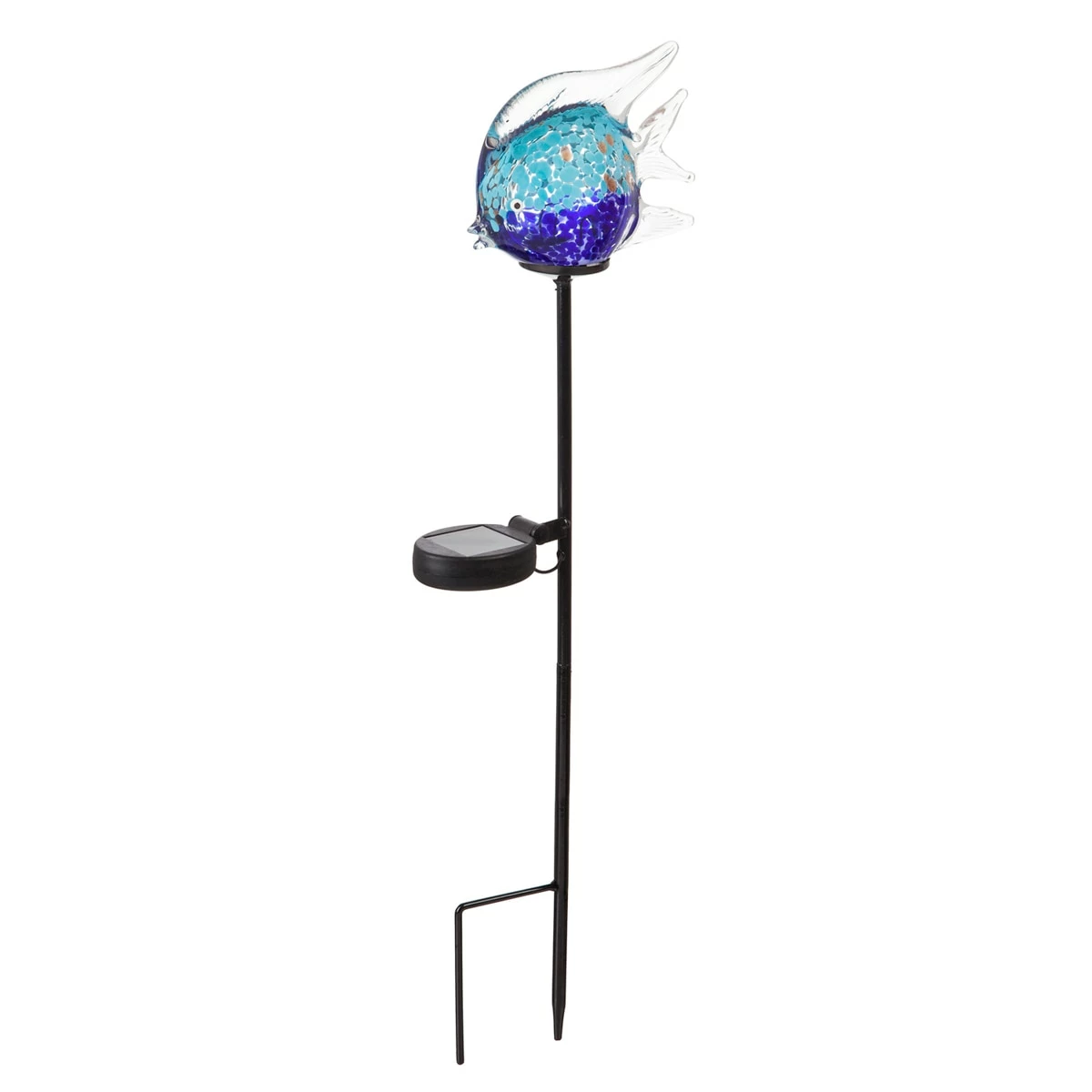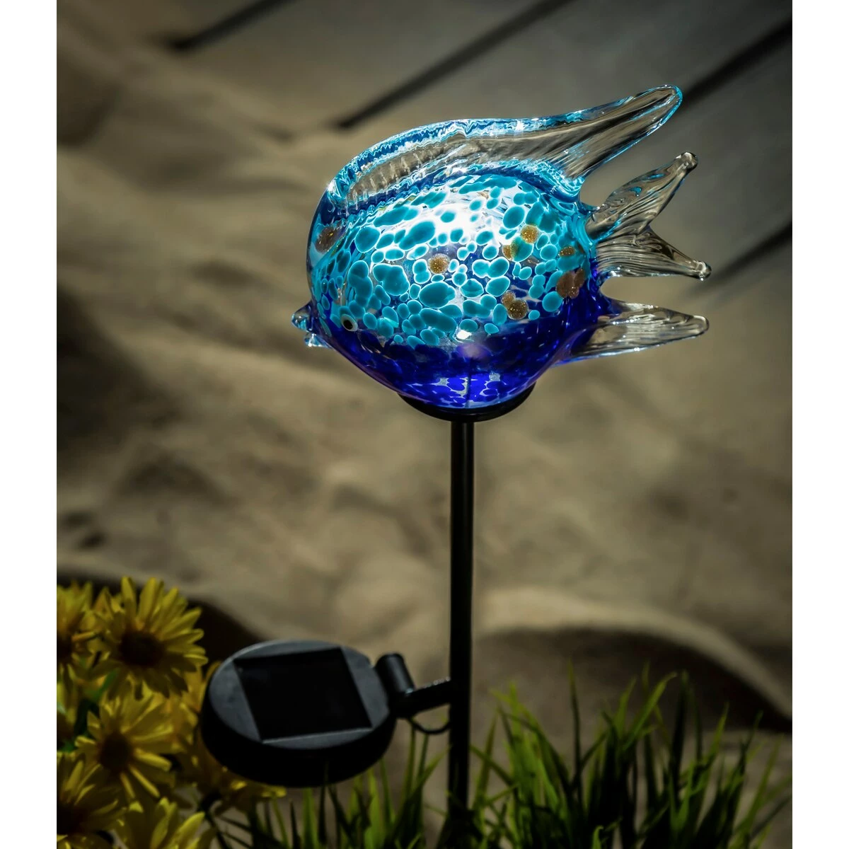 The stunning colors in this Evergreen tropical art glass fish stake are sure to make a tropical statement in any garden. Perfect for any outdoor space that needs a touch of coastal charm, this solar stake illuminates when the sun goes down. Powered by the sun, the stake needs up to 6 hours in direct sunlight for best results. The h-stake allows for easy insertion and display.