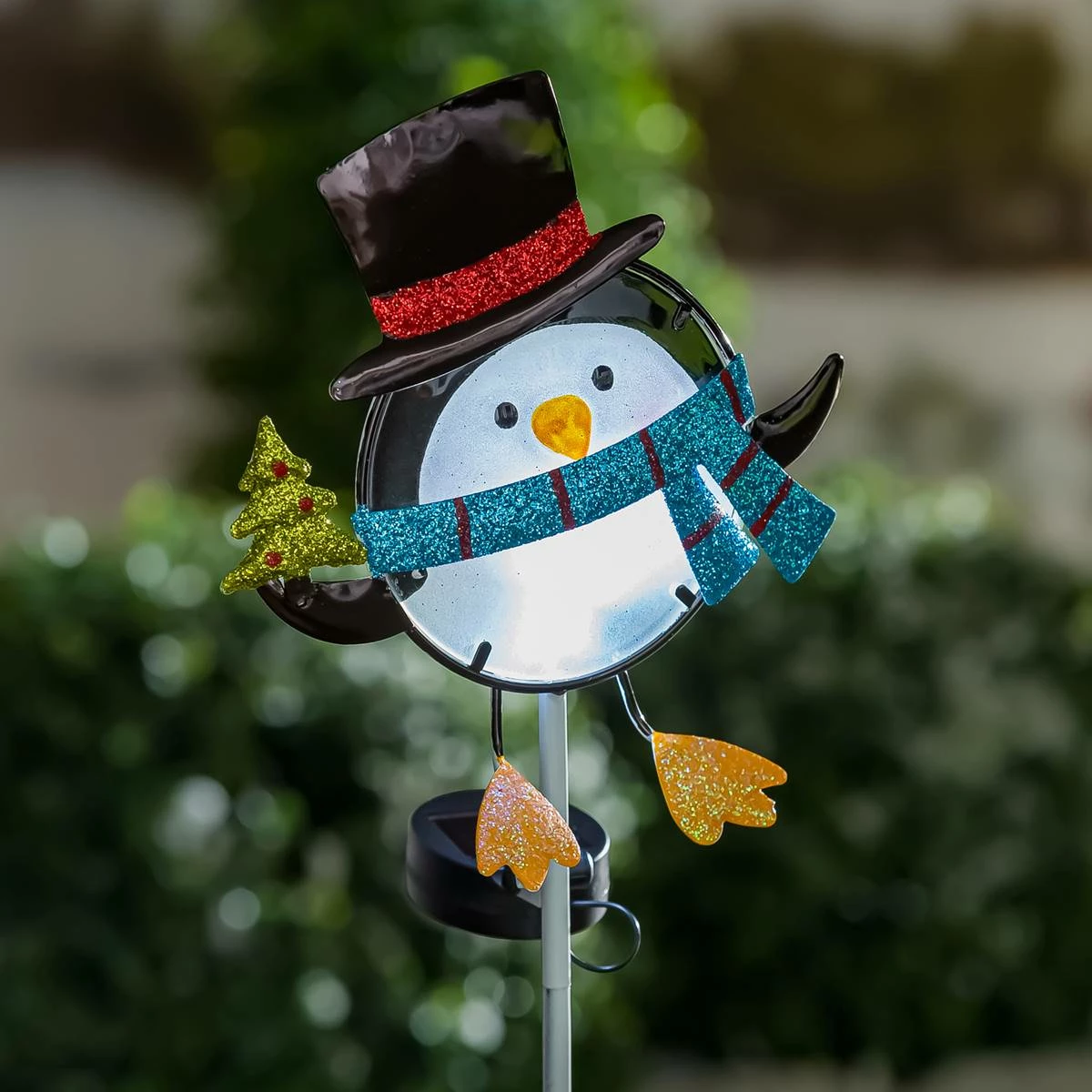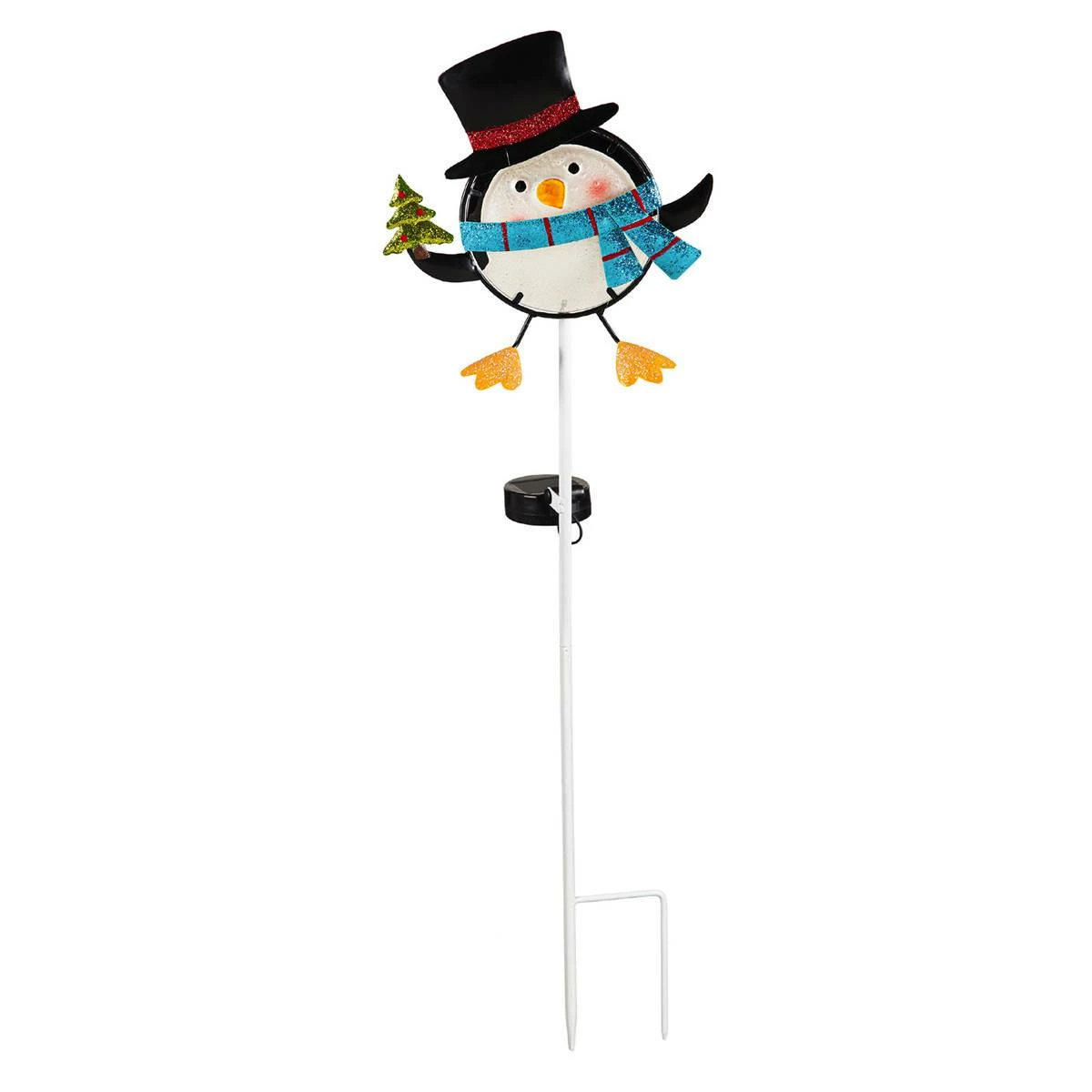 Brighten your holiday home with the inviting glow of this Penguin solar garden stake from Evergreen. This charming design features a penguin wearing a top hat with a blue scarf. Holding a Christmas tree, this penguin is ready to spread some holiday cheer. Perfect to display with your winter decor, this garden stake has an illuminating effect. Makes a great gift for a loved one. The arrowhead stake allows for easy display. Allow the stake to get at least 6 hours of direct sunlight to ensure a full charge. When fully charged, the stake should stay lighted for 6-8 hours.