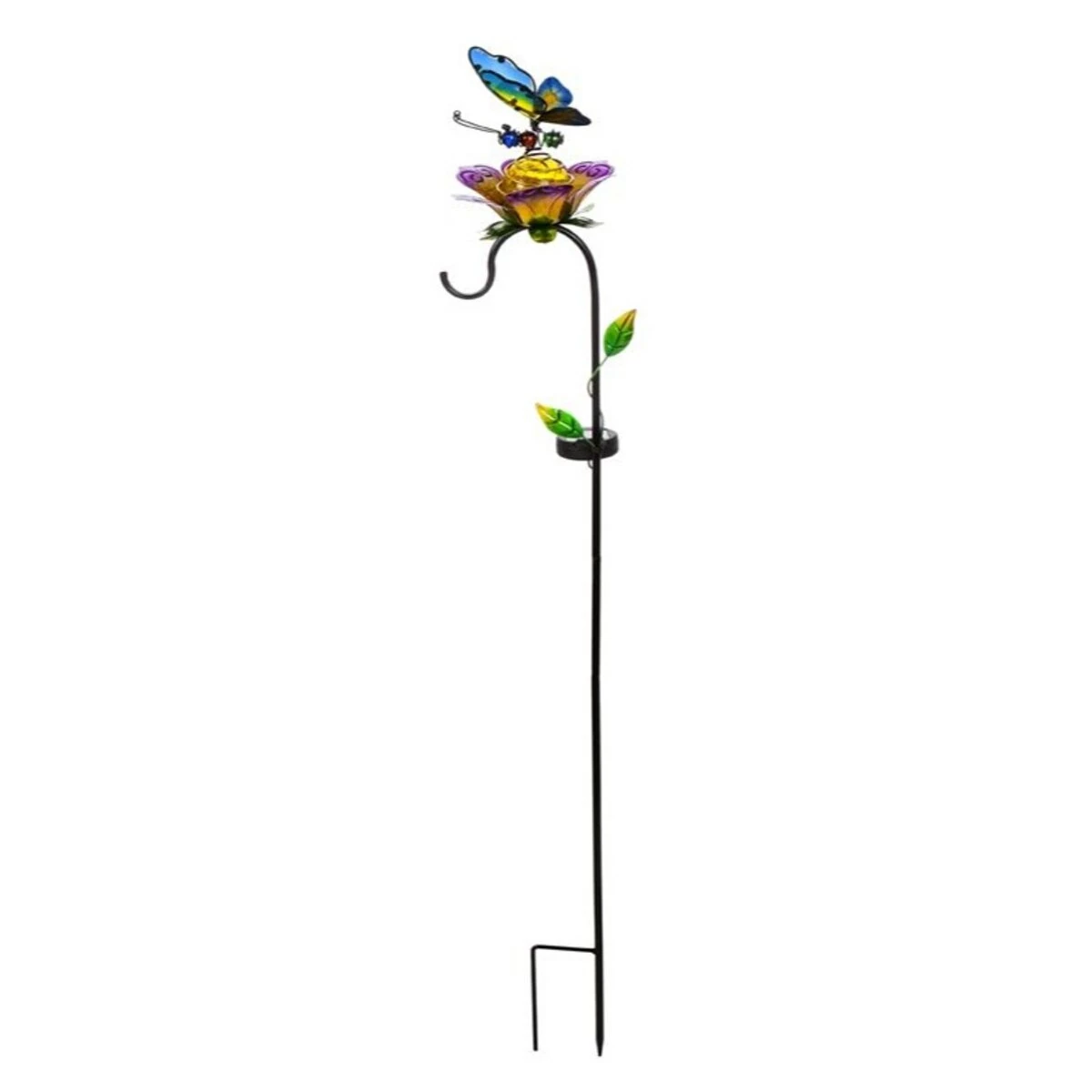 Your guests will be delighted when they catch a glimpse of this So Evergreen 37-inch solar butterfly and shepherds hook garden stake. Featuring a unique design and blue, green and yellow colors, this artful decoration will be the perfect addition for your outdoor space.Limited Manufacturer’s Warranty.