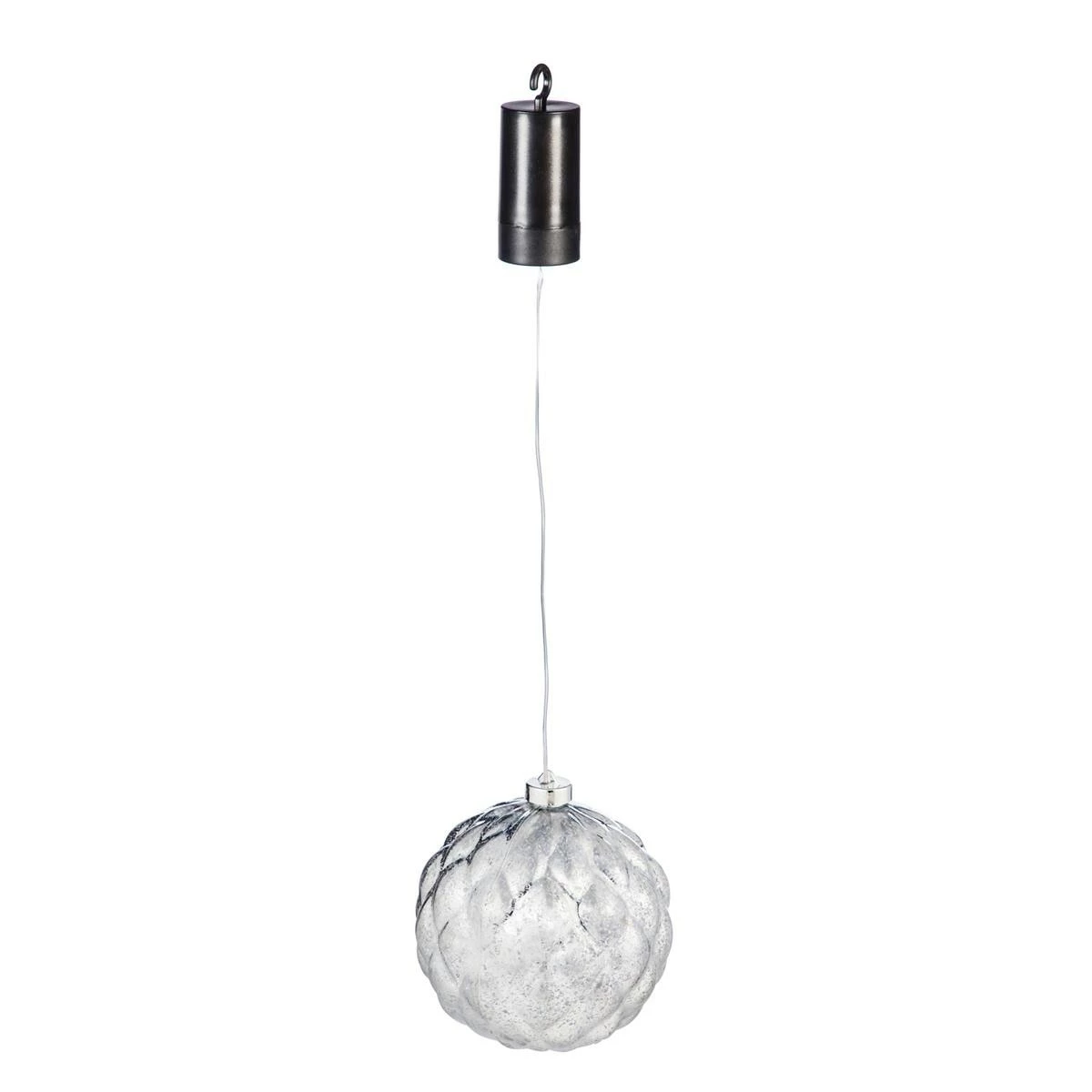 Perfect for sprucing up any outdoor space for the Christmas season, this Evergreen 6 inch shatterproof LED ornament is beautiful during the day and lights up at night for a spectacular show. The glimmering silver color and faceted texture of this uniquely shaped ornament adds to the stunning design, while white LED lights shine within. The ornament comes ready to hang by a plastic loop that makes display easy.