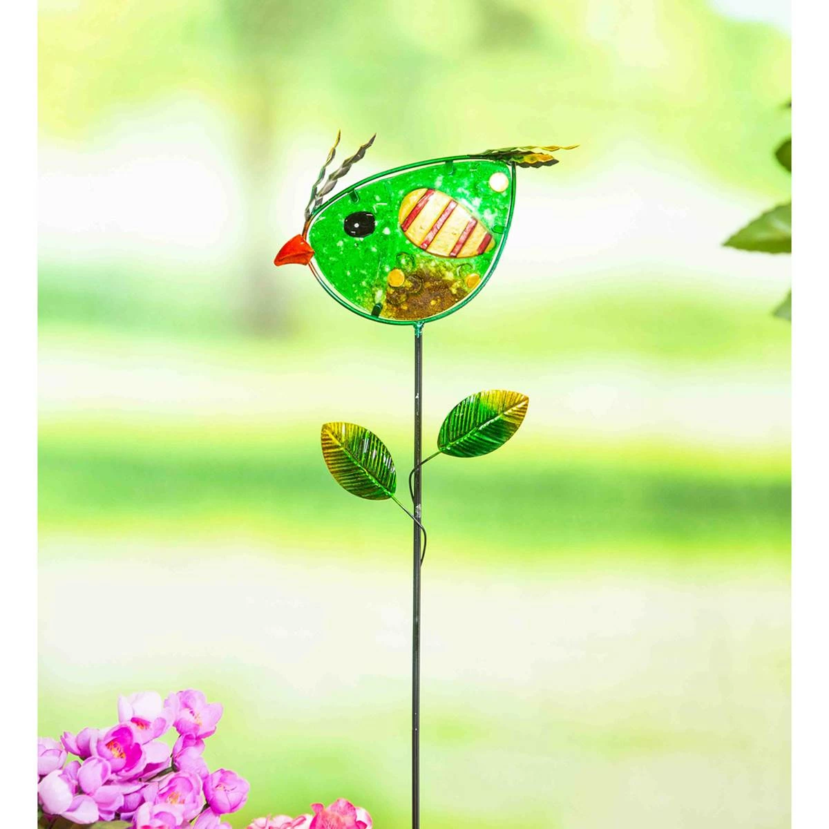 With a unique speckled design and textured metal embellishments, this colorful green bird garden stake by Evergreen will add a whimsical statement to any outdoor space. Perfect for gardens, yards, and more, this stunning garden stake will turn heads of any onlookers. The sturdy h-stake allows for easy insertion and display in damp grass or soil, no tools necessary.