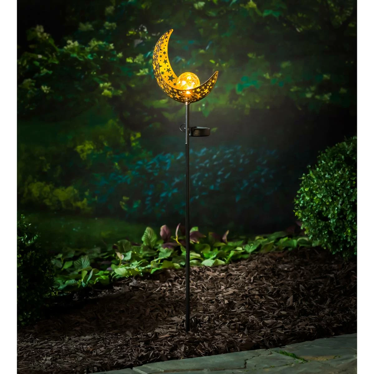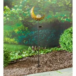 This crackle Moon solar garden stake Evergreen takes on the unique form of a stunning moon to catch the eye of guests and passersby. A glowing crackle glass globe glows from the center for a splendid display. Its crackled glass design provides a unique look. Makes a great gift for a loved one. Perfect to display in any outdoor space including gardens, yards, and flower beds, the design will bring a new and creative element to your decor. Place in direct sunlight to feel the full effect of this illuminating design. Allow the stake to get 6 hours of direct sunlight to ensure a full charge.
