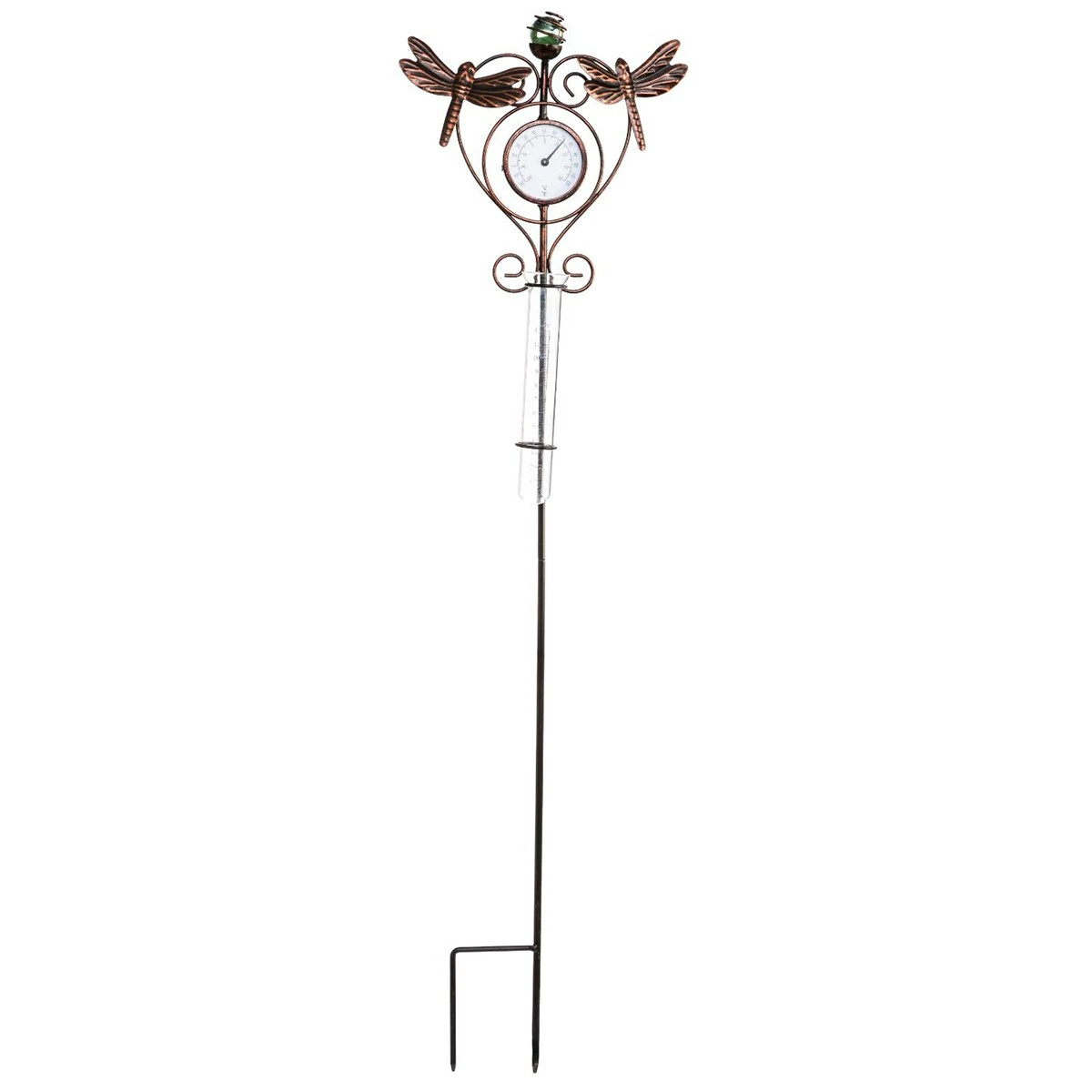 The unique design of this Evergreen dragonfly thermometer & rain gauge garden stake is a perfect blend of beauty and functionality. Measure temperatures and rain in style with this decorative accent. Featuring two embossed dragonflies in its design, this striking garden stake will make for a stunning addition to your outdoor space.Limited Manufacturer’s Warranty.