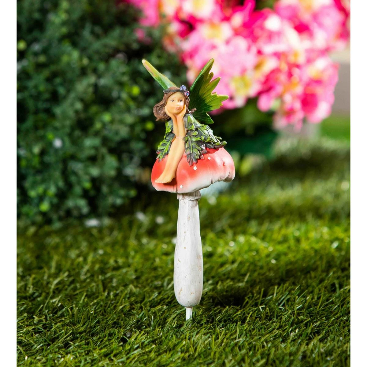 Bring a whimsical and ethereal touch to any garden or flower bed with this fairy holding her face garden stake from Evergreen. Holding her face, this nature-inspired fairy sits pretty atop a toadstool mushroom for a charming design that is sure to bring cheer to onlookers while adding character to any outdoor space. The carved details bring this design to life.