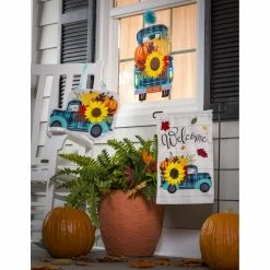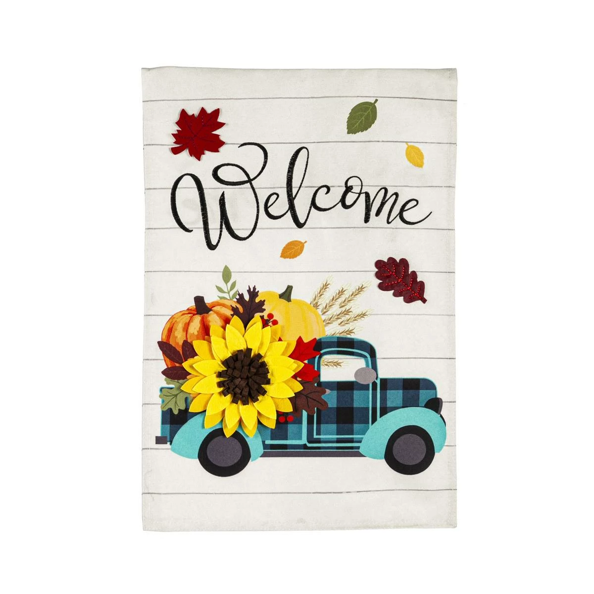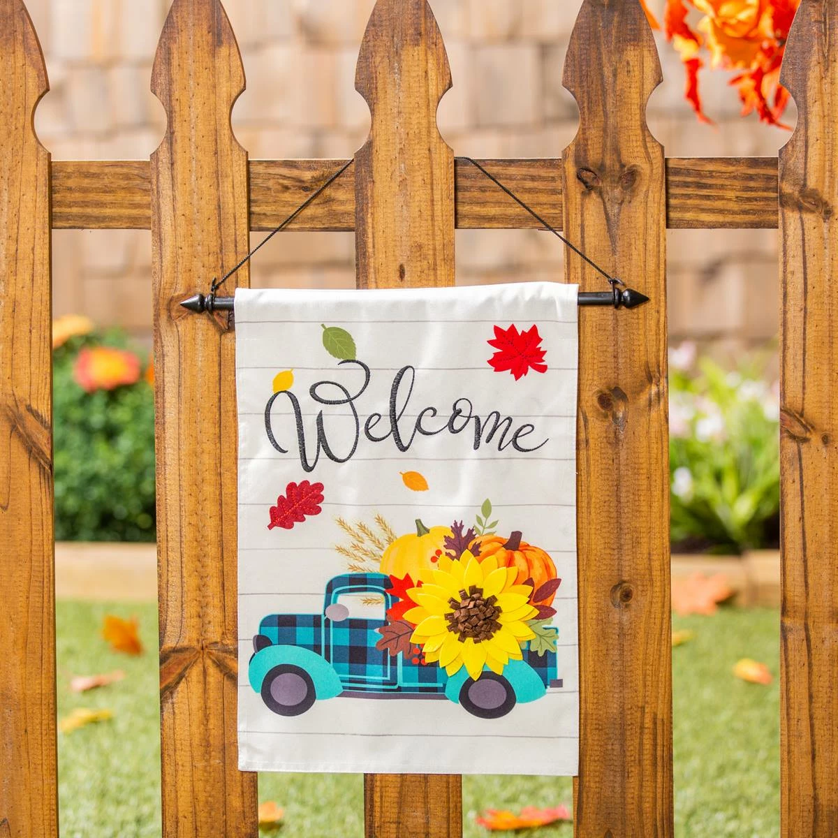 Add an extra dose of seasonal charm to your home and garden with this Evergreen Fall Plaid Truck garden linen flag. With its welcoming message, this design features a check-patterned truck filled with florals and pumpkins for a cheery design. Made of lightweight fray-resistant durable linen material, this lively flag is designed to withstand a variety of weather conditions. The flag creation process involves combining pieces of fade-resistant fabric with tight detailed stitching in order to create a dimensional effect. Printed ink colors are protected with a watertight seal, so you can enjoy this flag for years to come.
