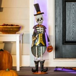 Who knew the walking dead could trick or treat? Complete with a top hat and black boots, this metal skeleton garden statue is searching for candy while wearing a formal outfit and holding a jack-o-lantern that reads “Boo.” The design is hand-painted with a festive color palette and features a hammered texture to give it a dose of rustic charm. Crafted of durable metal with a weather-resistant finish, this design is completely outdoors safe and won’t fade over time. A fun accent for the front porch, garden or indoors, display the skeleton in any space that needs an extra dose of Halloween cheer.