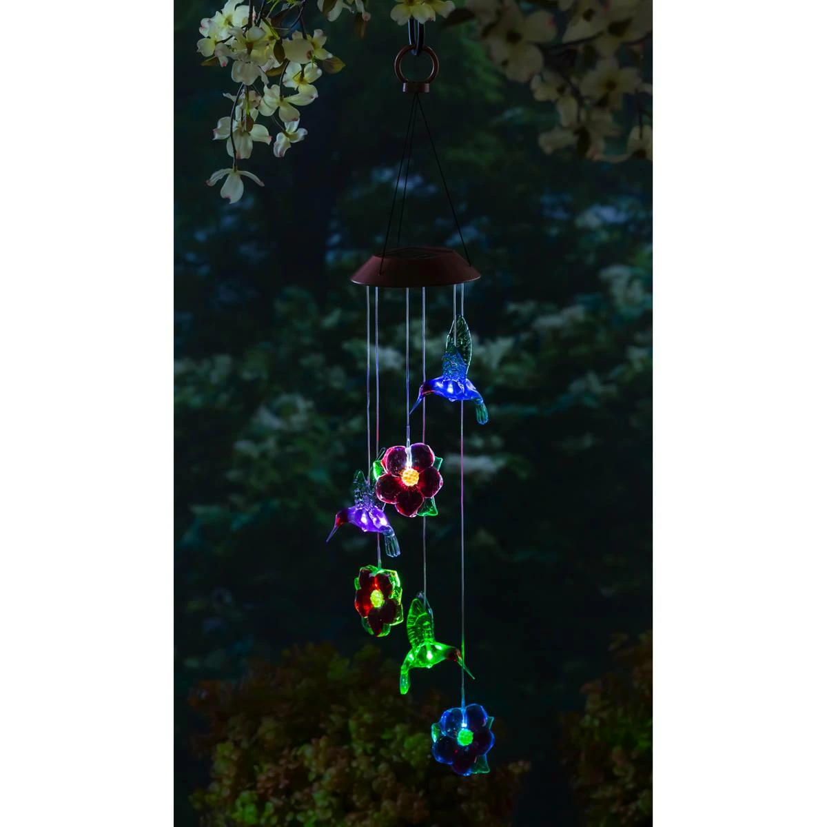Decorate your garden during the day and color it at night with Evergreen’s distinctive color-changing solar powered mobile. The topper features an attached cord for hanging and houses the solar panel. Display anywhere in direct sunlight for best results as the solar panel charges during the day. The hummingbirds and flowers hang daintily from the top and change color. The solar panel turns on automatically at dusk and lasts up to 8 hours after full charge.