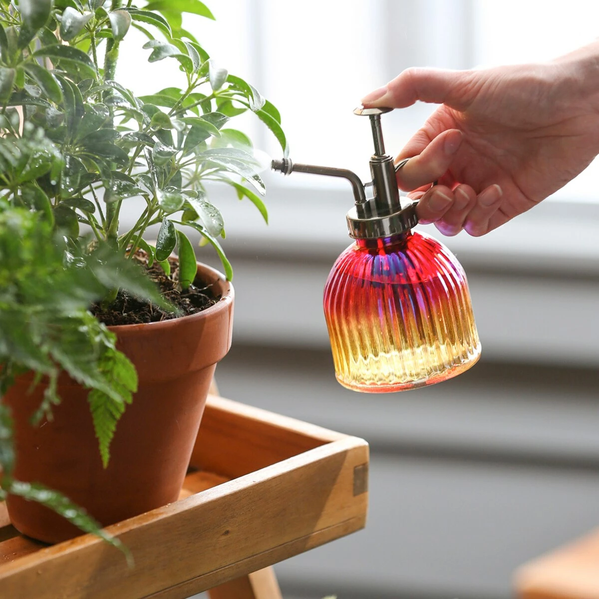 Your blooms and flowers will be perfectly hydrated with this red Evergreen iridescent ombre plant mister. Its classic pump function adds to the antique feel and look of this necessary garden accessory. Always water your plants with the perfect amount with this mister. Easily handle the pump with the ring finger holder. Adds a stylish element to everyday gardening. Crafted from weather-treated and UV-treated materials, this mister will last for years to come.