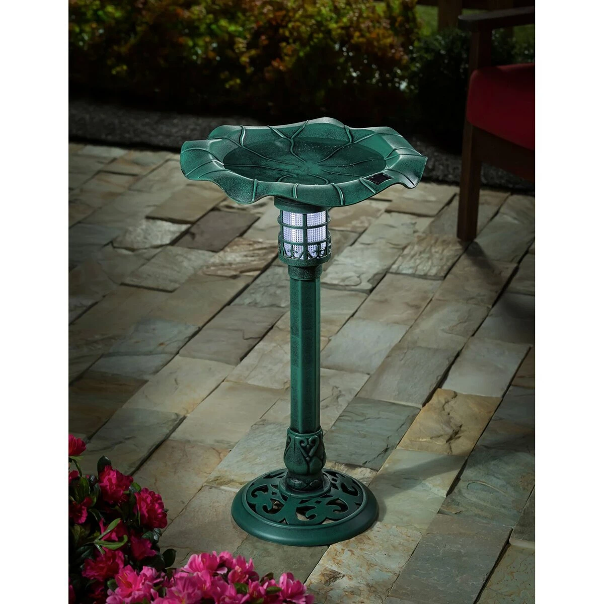This Evergreen lily pad in green patina solar bird bath is sure to be a hit in your home or garden! Simply place in sunlight and watch as a festive design lights up at night.This item requires oversize delivery. Please refer to the Order Summary in the Shipping step at checkout for delivery charge.Limited Manufacturer’s Warranty.