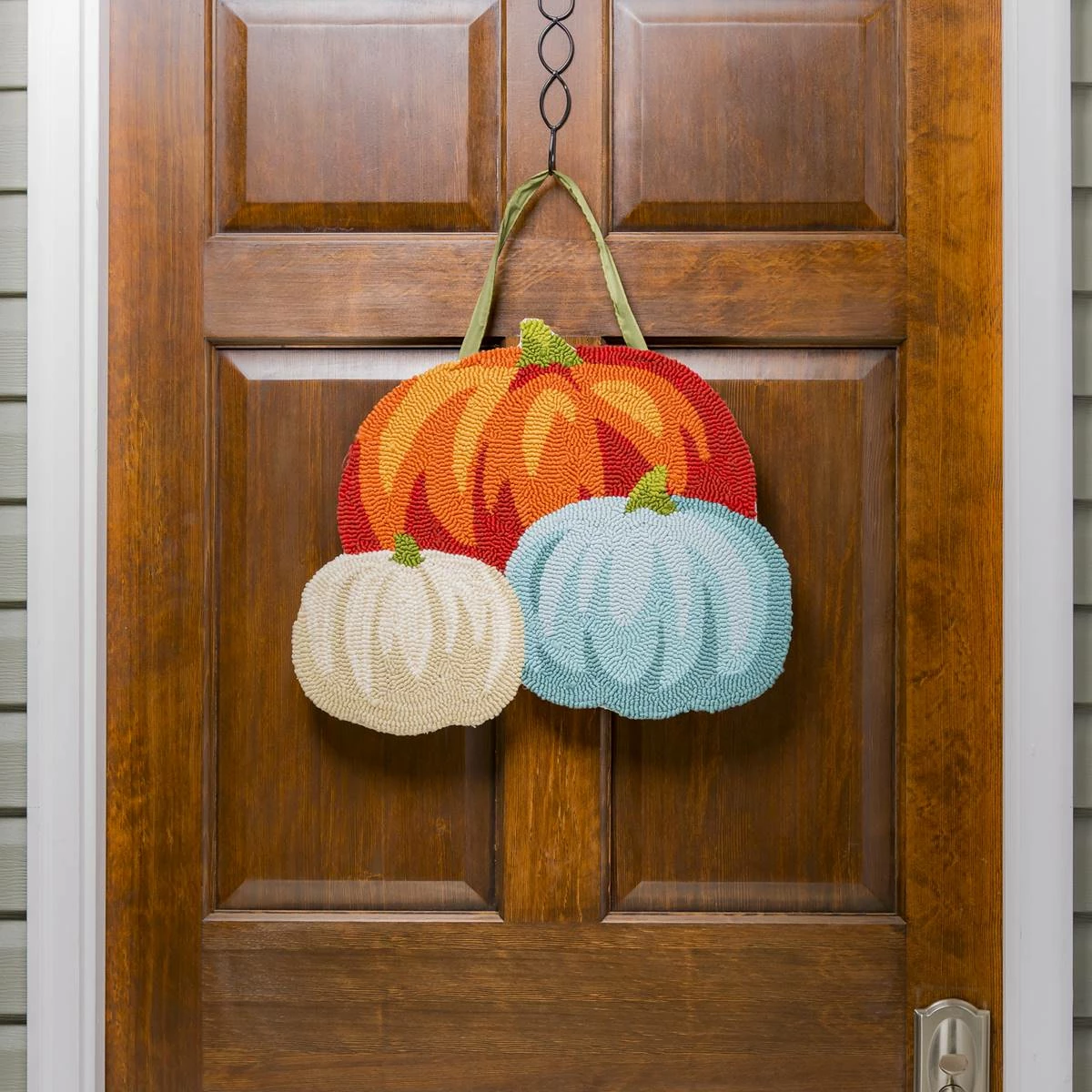 In three striking colors, this Evergreen pumpkin trio hooked door decor will make a beautiful statement on your front door for the fall season. The hooked technique of this design brings texture and dimension to any space. Specially shaped and made of polypropylene, this design is crafted of outdoor safe materials that last for seasons to come. Durable and weatherproof, this door decor won’t fade or fray over time. The display is made easy with the coordinating ribbon.