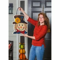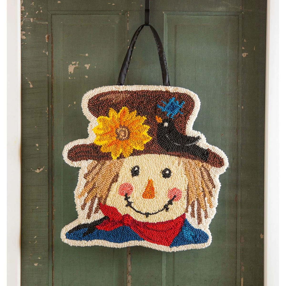 This Evergreen Scarecrow hooked door decor offers a charming fall decoration for any home. The design features a friendly scarecrow accompanied by a feathered friend perched on the hat. This door piece is a fun and creative way to spruce up autumn decor. Crafted from washable polypropylene with canvas backing, the design is indoor and outdoor safe. The hand-hooked technique creates a unique texture that ensures this door decor will stand out. Perfect for the Thanksgiving season, the design hangs from a coordinating grosgrain ribbon.
