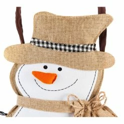 This Evergreen snowman burlap door decor will greet guests in style during the holiday season. The classic snowman design has dimensional details and 3D accents to get family and neighbors in the Christmas spirit. Display this charming snowman on your door all winter long. This Burlap Door Hanger is crafted from a medium-weight, poly-burlap material with detailed stitching. Perfect for winter, the design hangs from a coordinating ribbon that compliments the overall design.