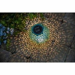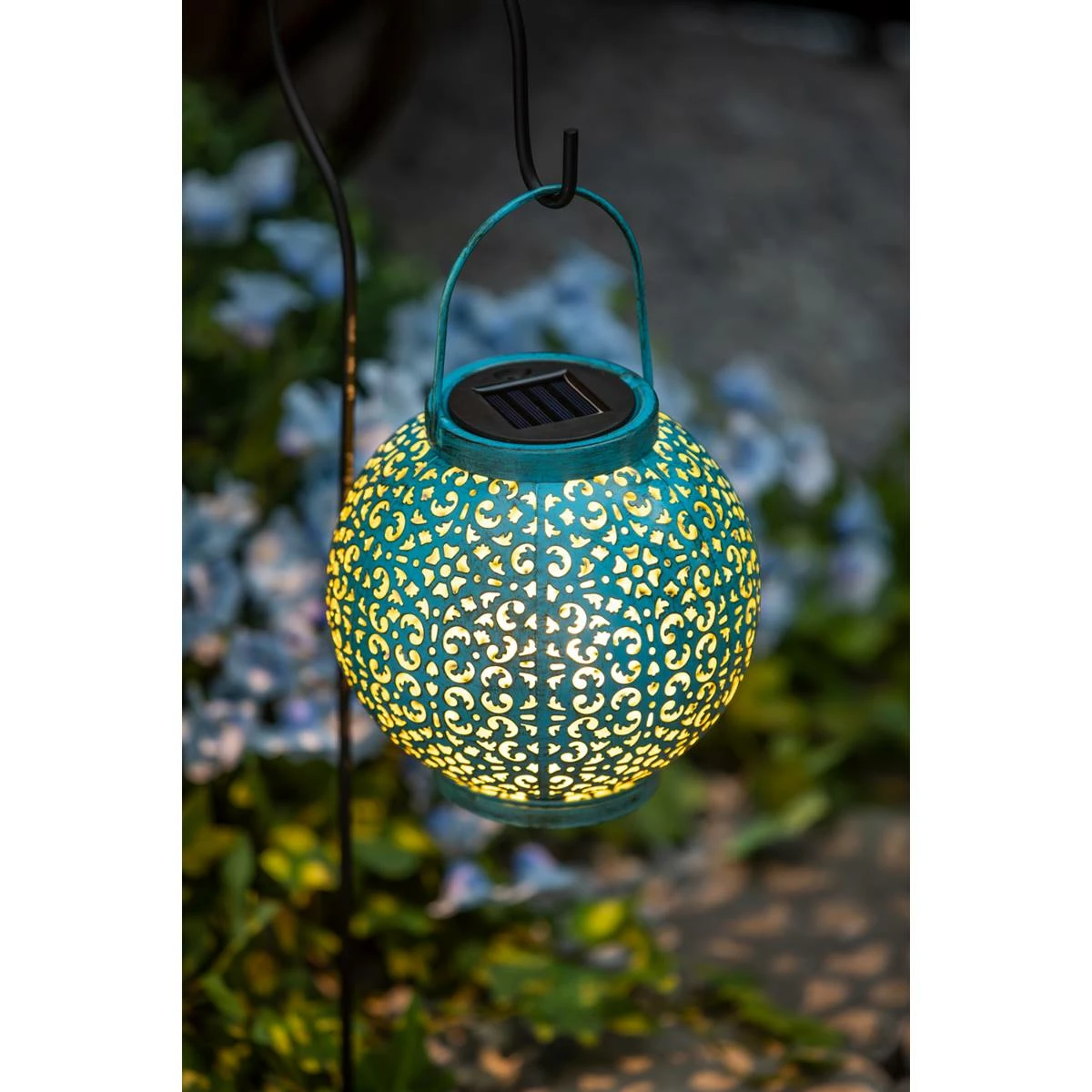 Create a mesmerizing oasis in any outdoor space with this stunning solar cut-out lantern from Evergreen. With a sleek turquoise blue finish, this large lantern features a stunning pinhole cut design that creates shadows at night for an elegant sight. Simply allow the lantern to get at least 6 hours of direct sunlight and watch as it lights up when night falls. Its handle makes hanging easy on a porch, patio, garden, and more.