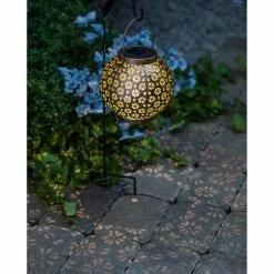 Create a mesmerizing oasis in any outdoor space with this stunning Evergreen metal solar cut-out lantern. With a sleek bronze finish, this large lantern features a stunning pinhole cut design that creates shadows at night for an elegant sight. Simply allow the lantern to get at least 6 hours of direct sunlight and watch as it lights up when night falls. Its handle makes hanging easy on a porch, patio, garden, and more.