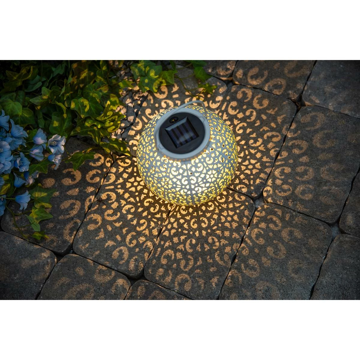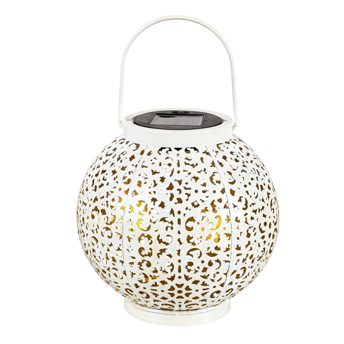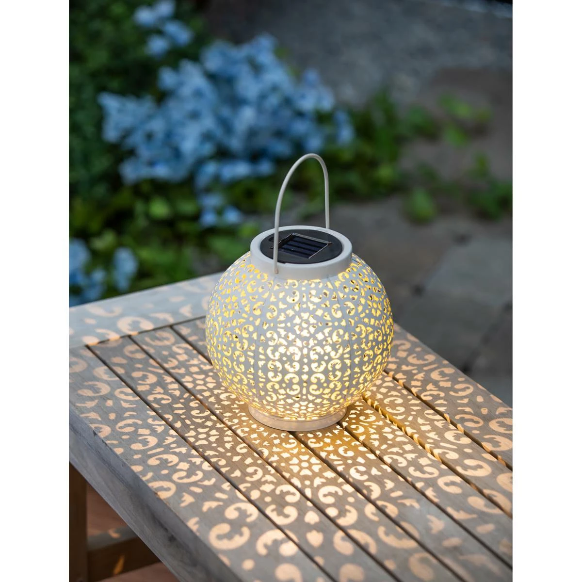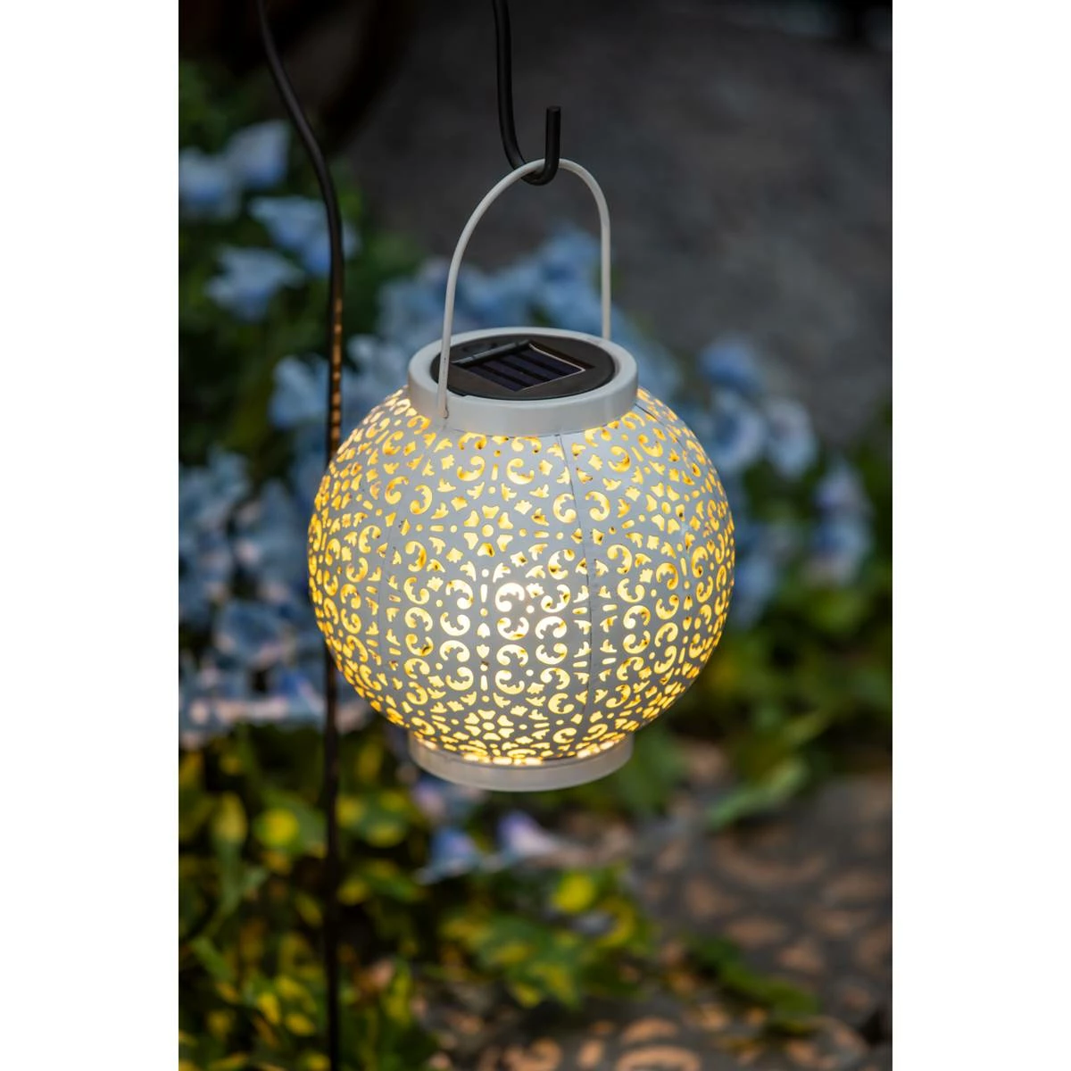 Create a mesmerizing oasis in any outdoor space with this stunning solar cut out lantern from Evergreen. With a sleek white finish, this large lantern features a stunning pinhole cut design that creates shadows at night for an elegant sight. Simply allow the lantern to get at least 6 hours of direct sunlight and watch as it lights up when night falls. Its handle makes hanging easy on a porch, patio, garden, and more.