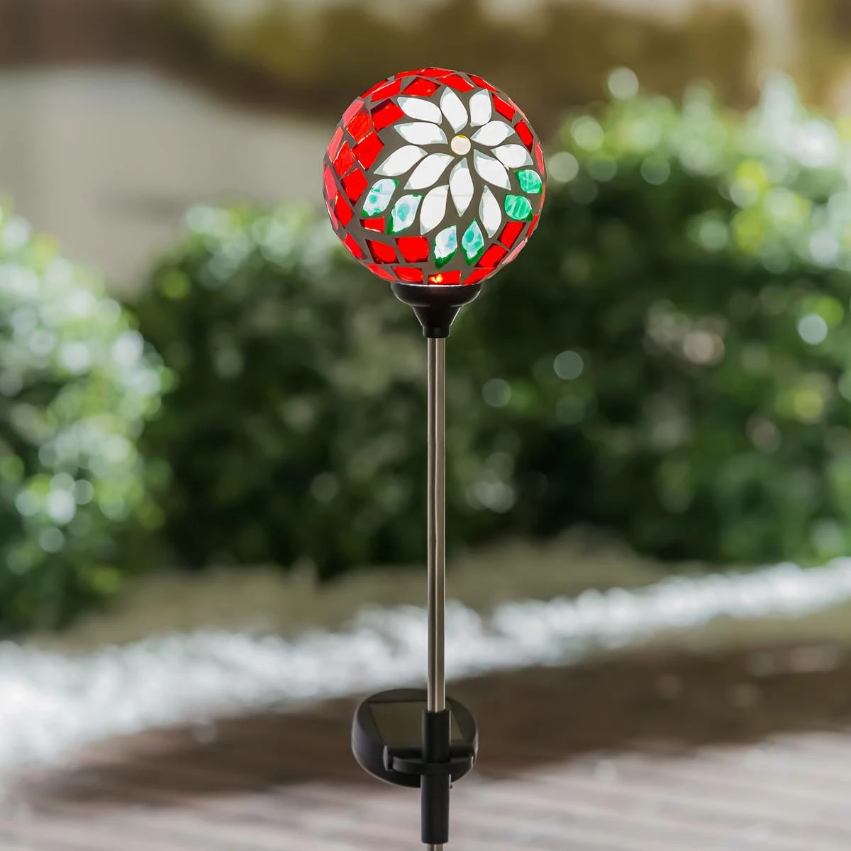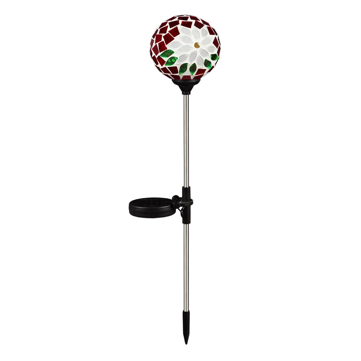 This breathtaking Evergreen poinsettia garden stake is a festive way to add color to any garden for the holiday season and beyond. The solar-powered stake features a white and green mosaic poinsettia design that comes to life as the sun goes down. Allow the panel to get at least 6 hours of direct sunlight for a full charge, and the globe will shine throughout the night.