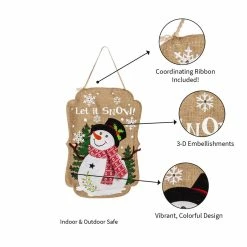 This Evergreen sparkle snowman lighted door decor is enjoying the winter snow with a sparkle in his eye. This hanging winter door decor sparkles with him with the internal battery pack that powers the internal twinkle lights. This Burlap door hanger is crafted from a medium-weight, poly-burlap material with detailed stitching. This classic design is perfect for winter and hangs from a coordinating grosgrain ribbon.