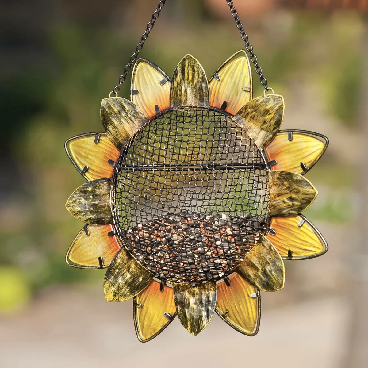 Attract more of your feathered friends with this Evergreen sunflower bird feeder with perch. This bird feeder combines functionality and beauty and will fit in perfectly with your outdoor space. Its mesh design allows for easy access for birds seeking nourishment as they travel from near and far. The design will bring color and life to your home as it shines and sparkles in the sunlight. The design includes a shepherd’s hook for easy display.