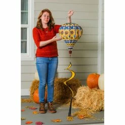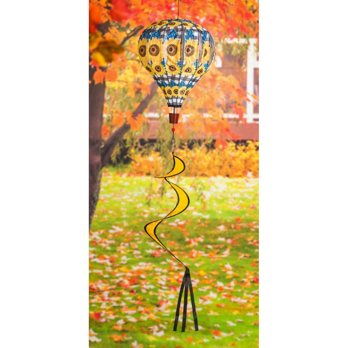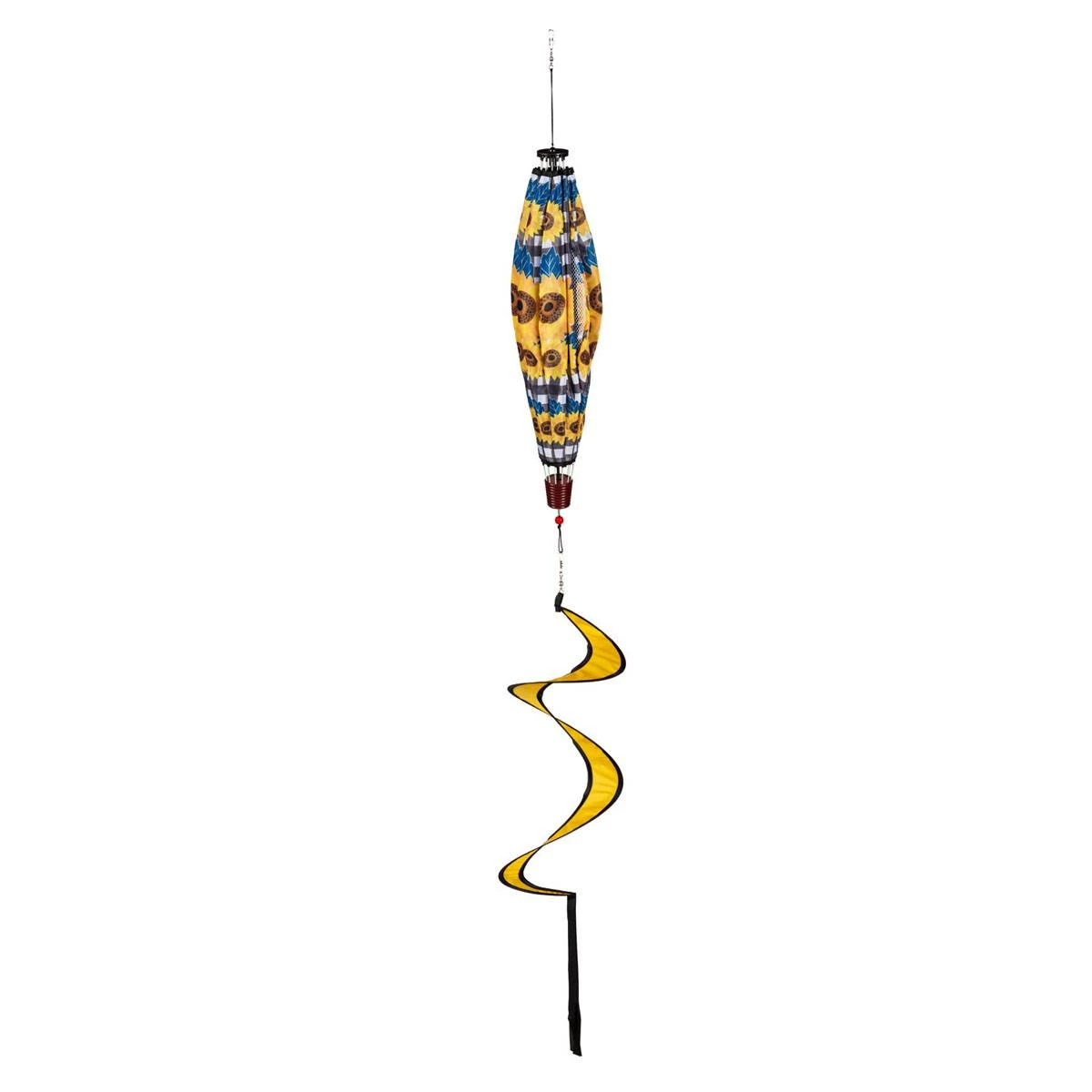 This Evergreen Sunflower Check balloon spinner is a unique way to spruce up your outdoor space for the fall season. This spinner features a hot-air balloon design and vibrant sunflowers with black and white buffalo check details. Watch as the spinner comes to life in the autumn wind, creating a kaleidoscope effect that will mesmerize guests all season long. Crafted from durable weather-resistant nylon, Evergreen’s balloon spinners have a mesh panel and spiral tail that keep the designs in motion every time the wind passes. A plastic spring latch keeps the spinner secure without assembly.