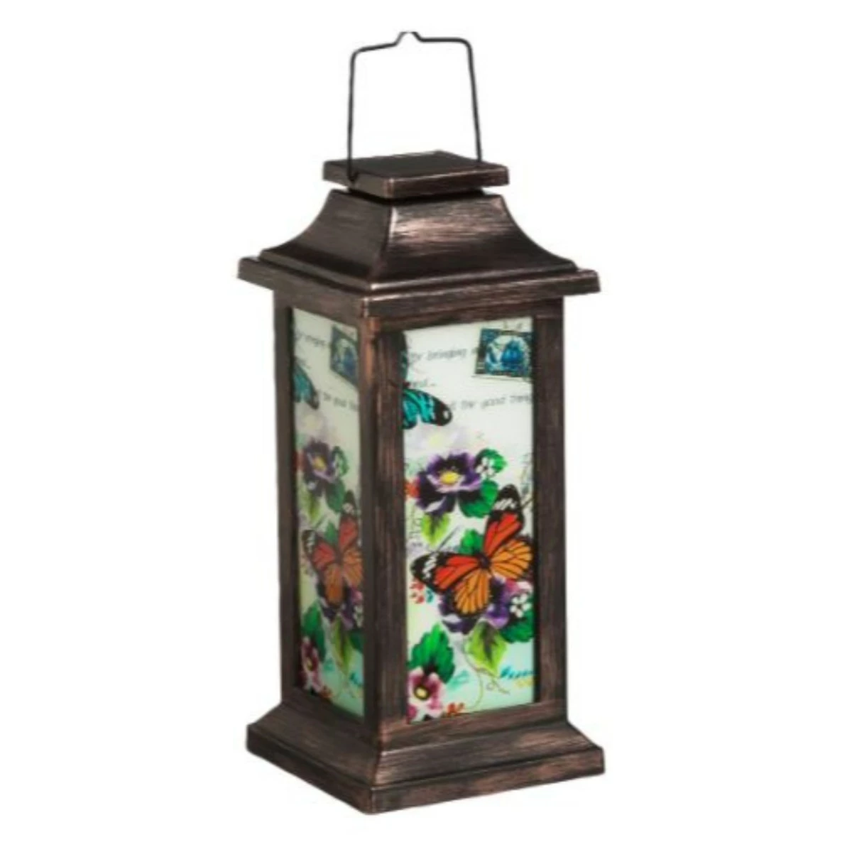 A graceful monarch trickles in through the light of this Evergreen fluttering garden friends butterfly solar lantern. Great for lighting up your outdoor space at night in delightful fashion. A gorgeously detailed butterfly is printed on the side as it flies through beautiful pink and purple florals.Limited Manufacturer’s Warranty.