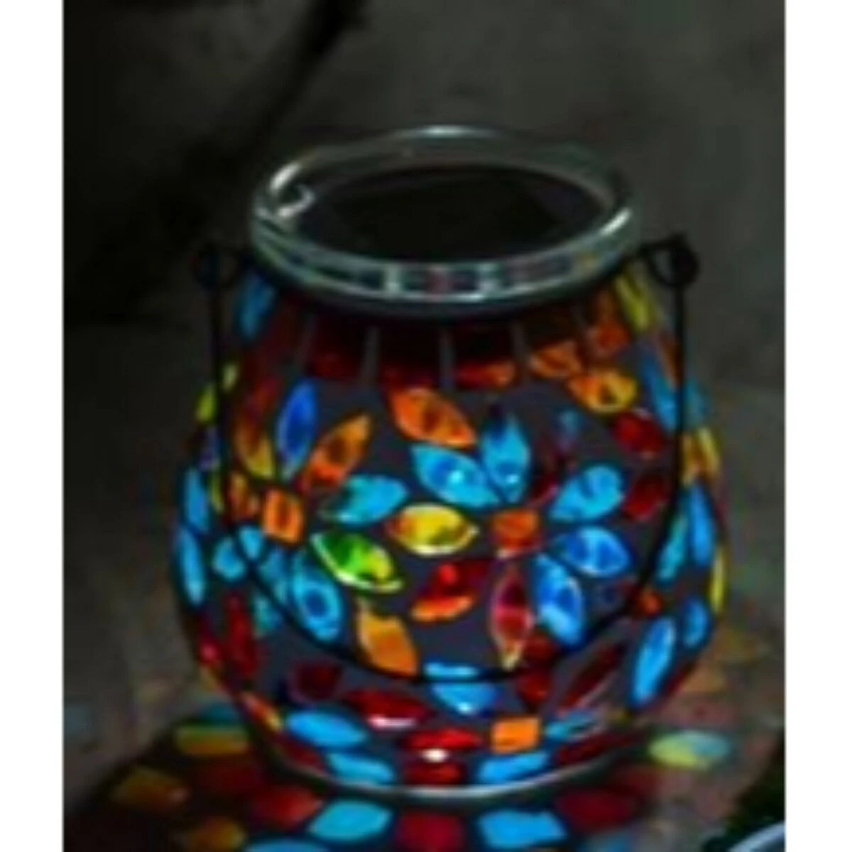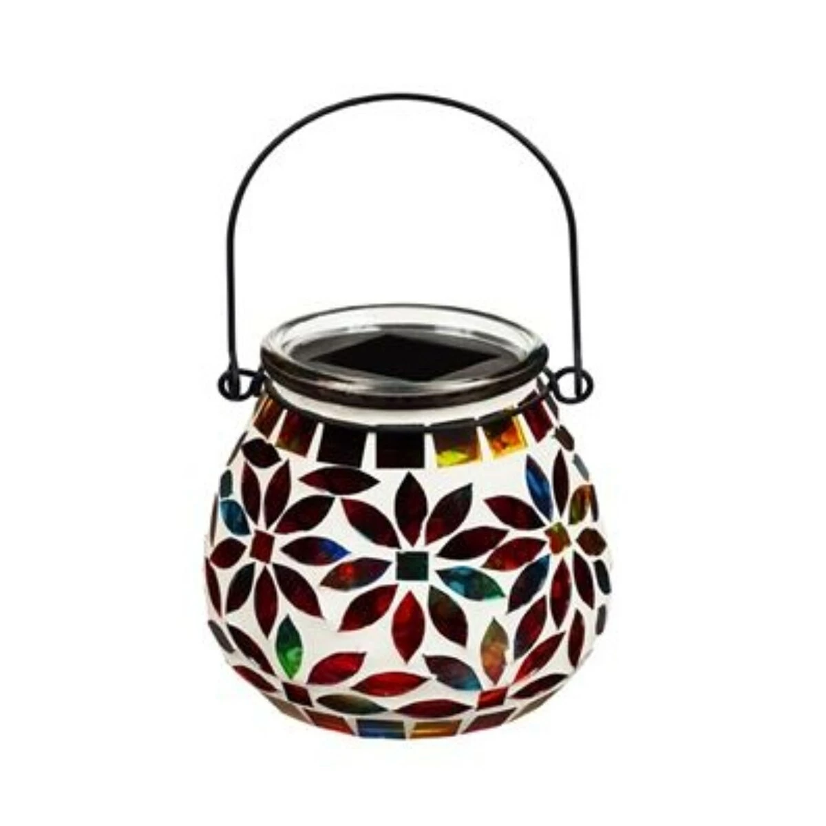 Showcase your creativity by lighting up your decorative space with this Evergreen garden icons and florals mosaic solar lantern. A multi-colored and floral mosaic design will provide the perfect glowing ambience for your night garden. It can also be displayed on a table top as a unique indoor decoration.